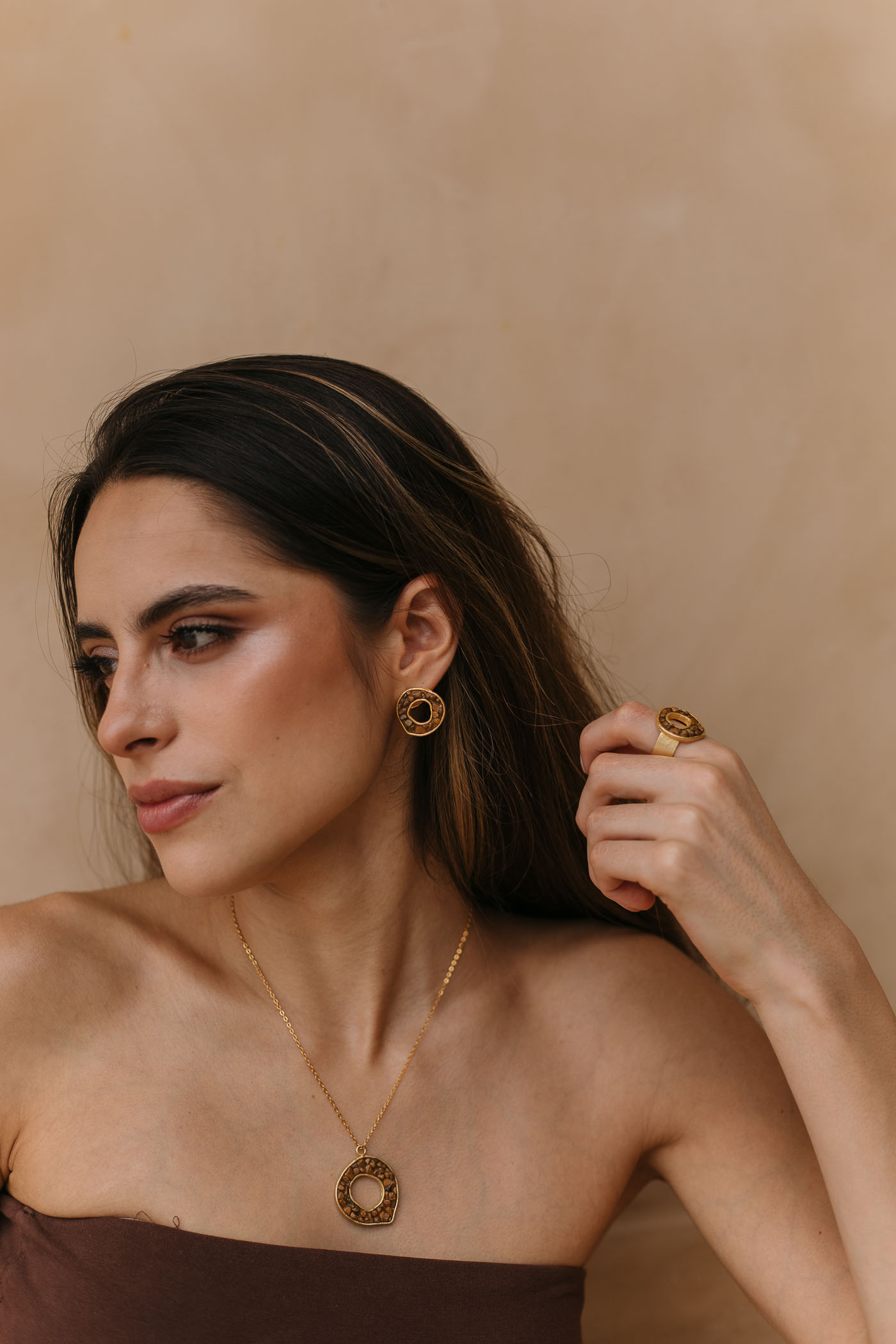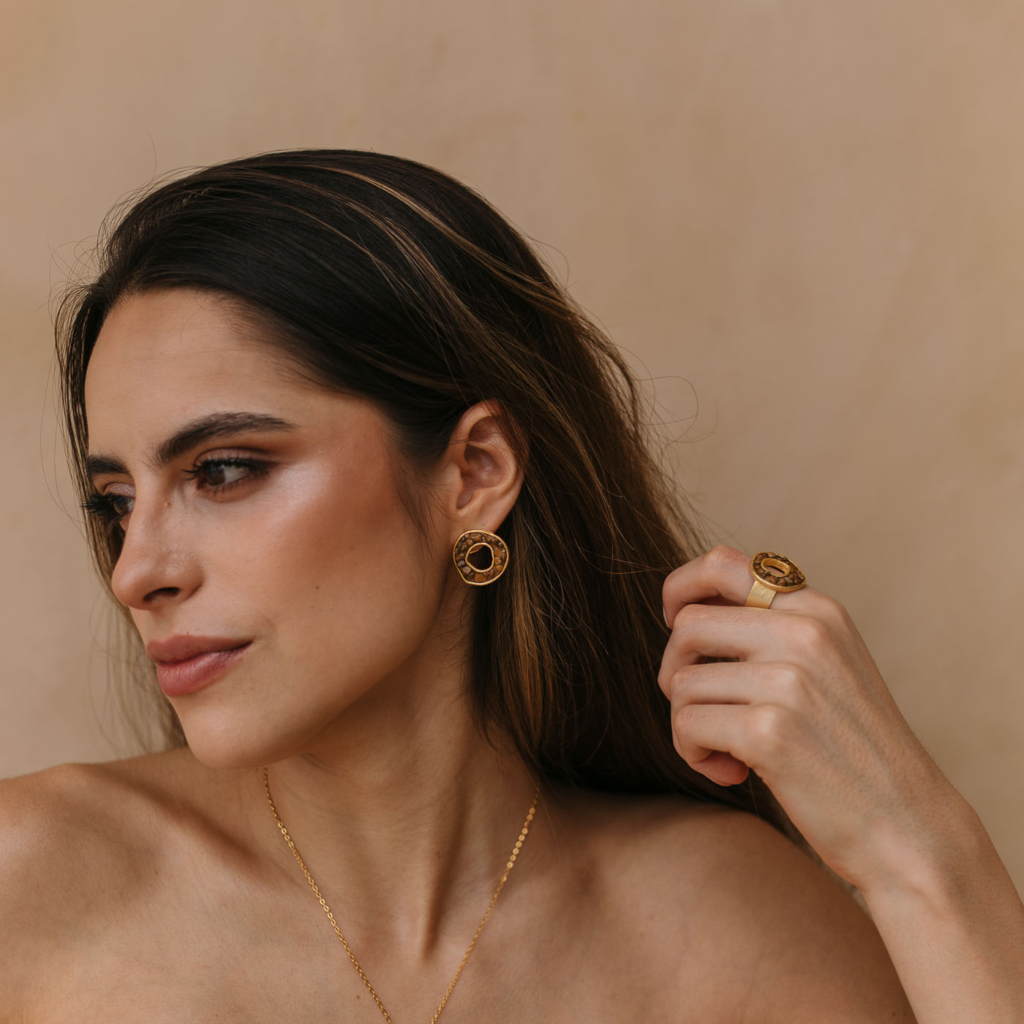 • Aretes medianos con piedra semi-preciosa jaspe marrón.