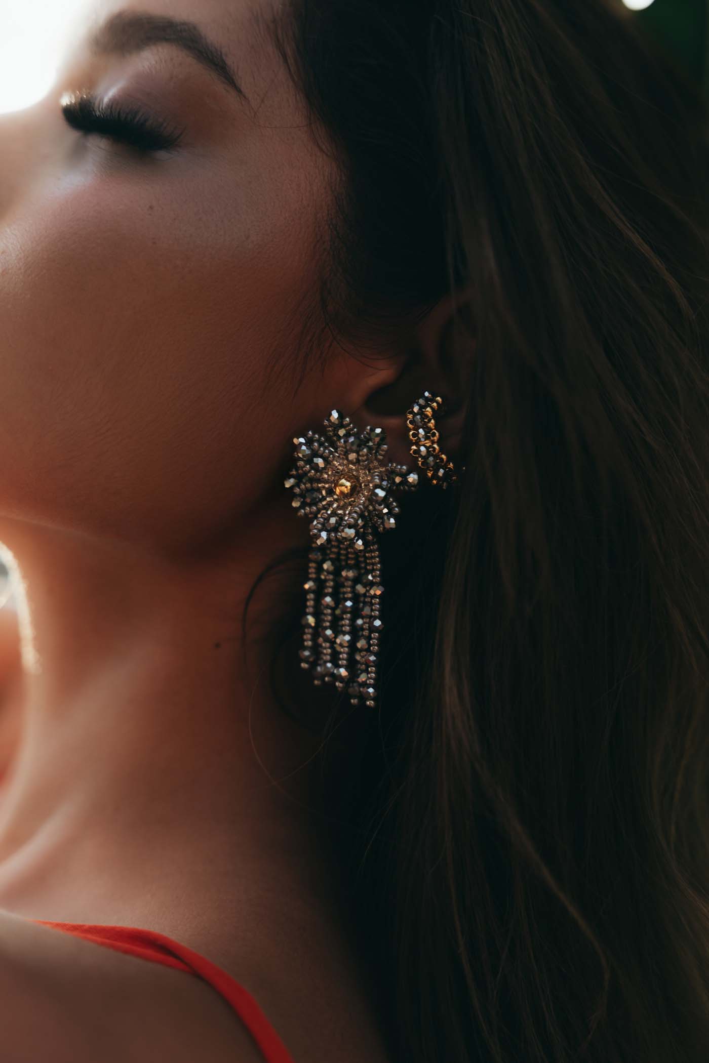 • Arete de flor con caída tejido a mano con beads.