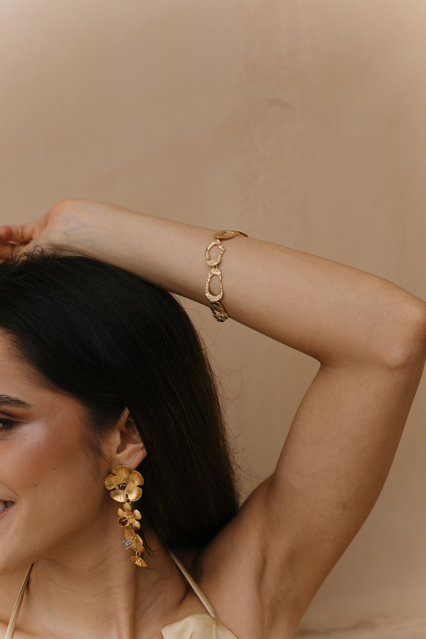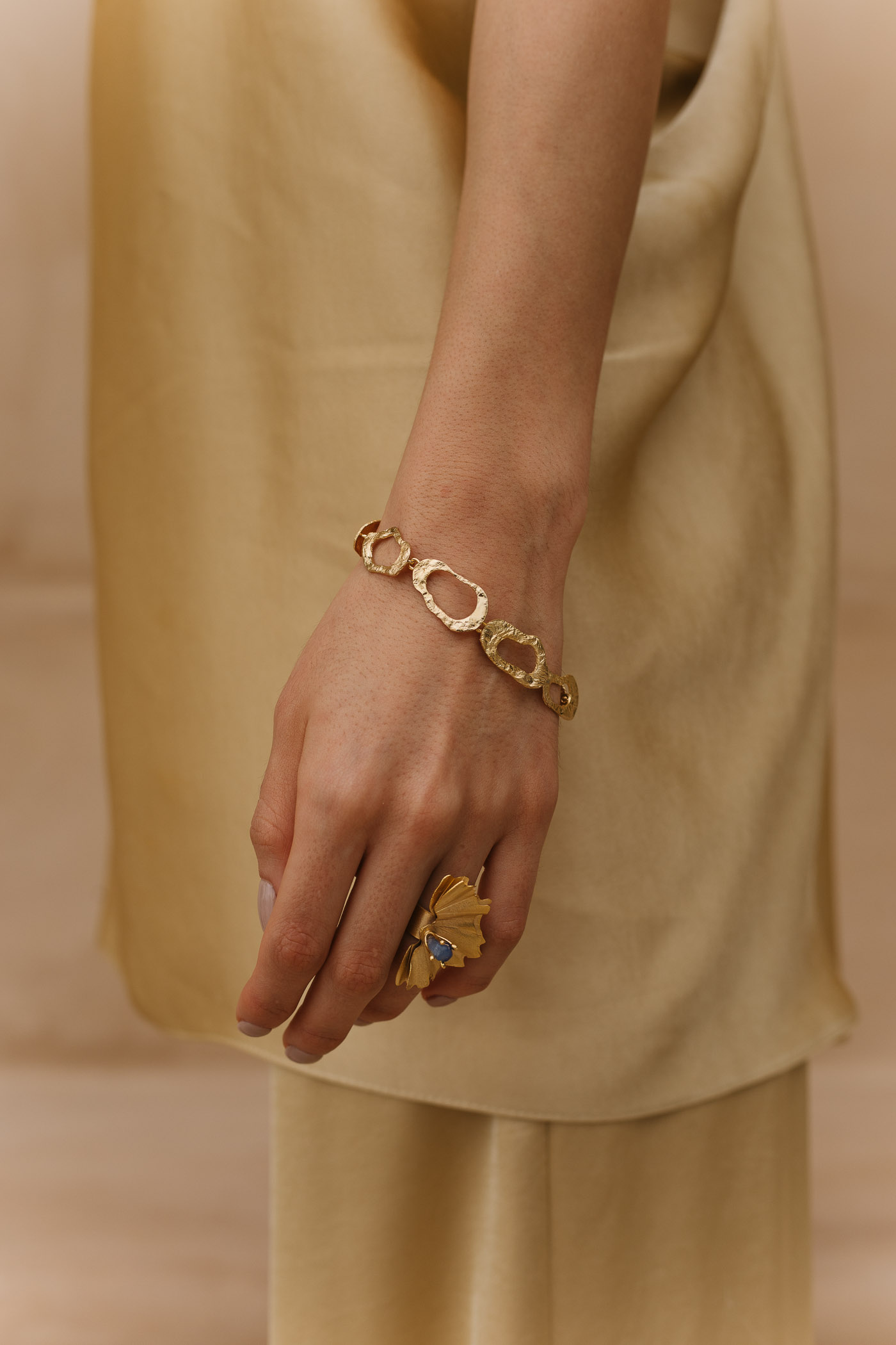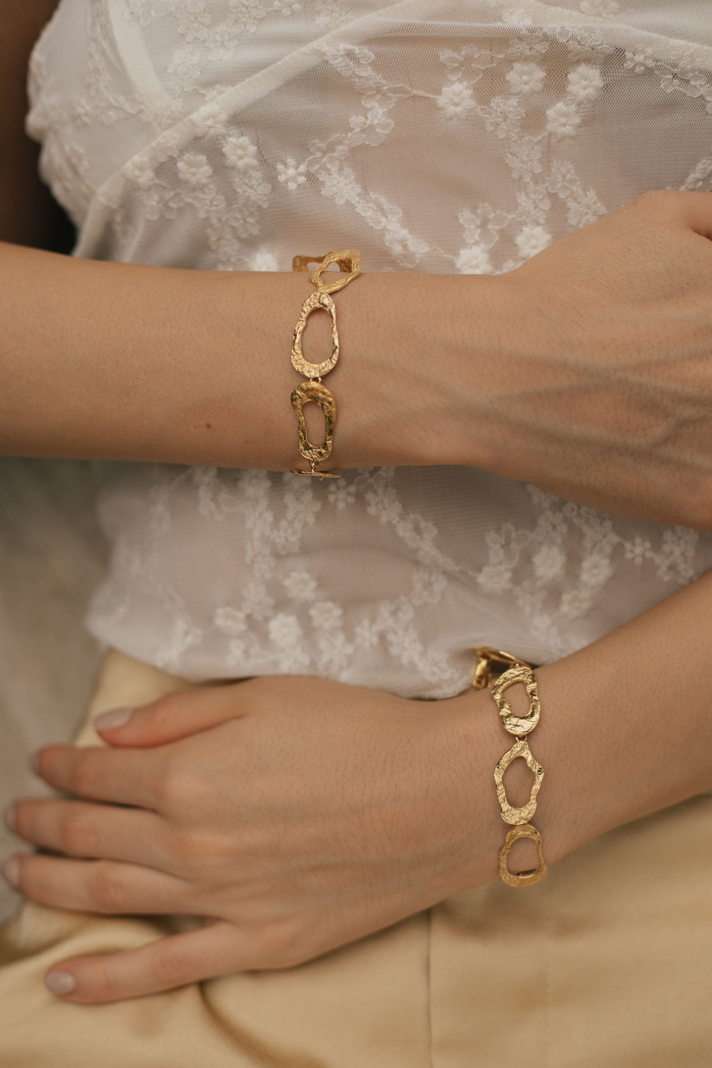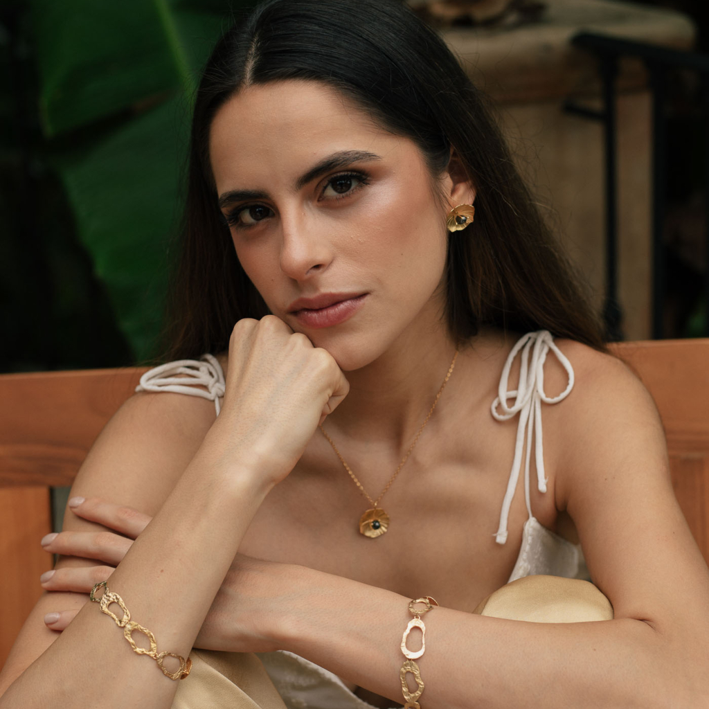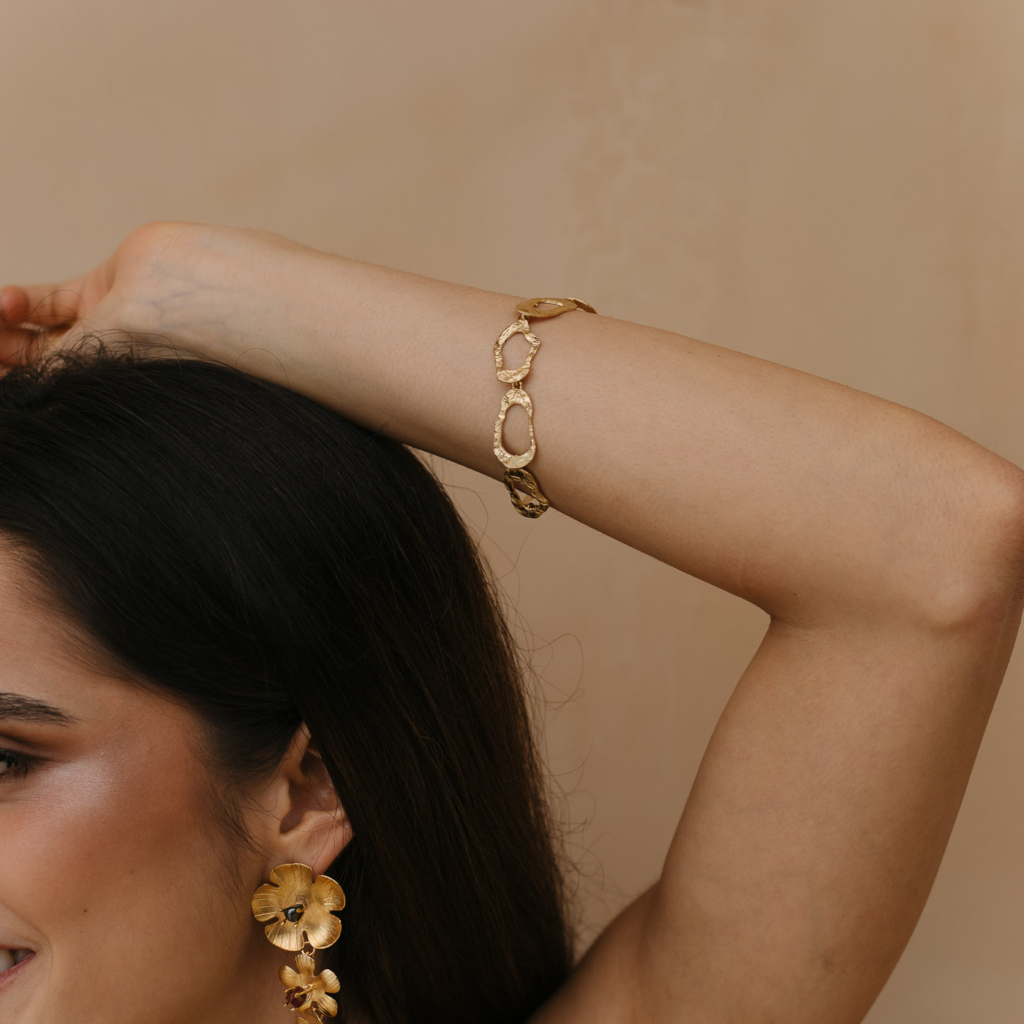 Una pulsera que recuerda el movimiento y brillo de las formas orgánicas: sutil, imperfecta y llena de carácter. Diseñada para acompañar cualquier look.