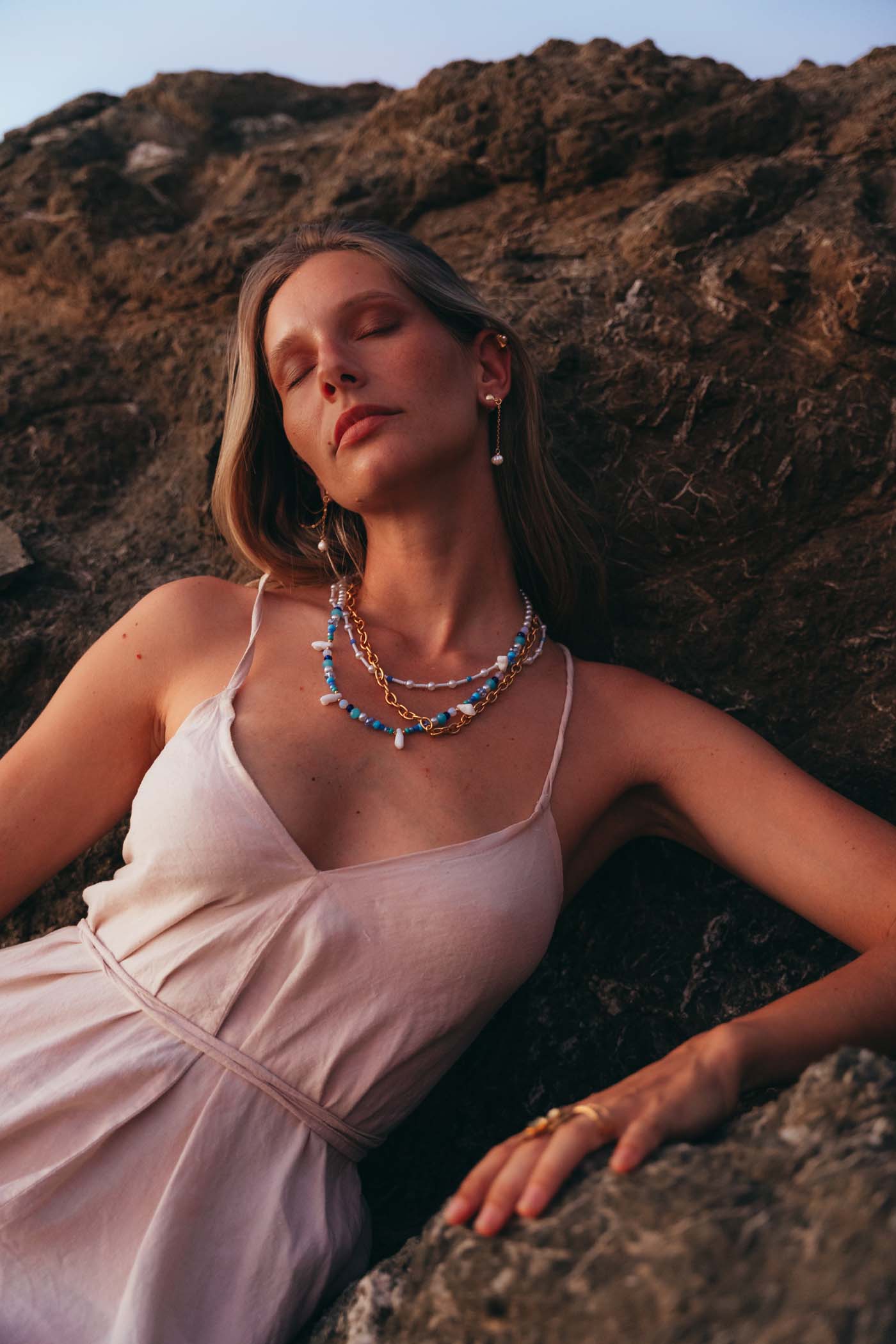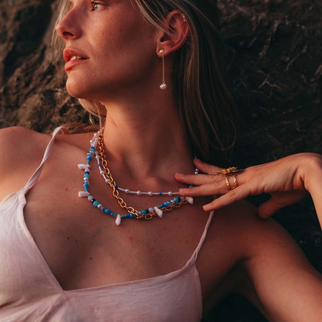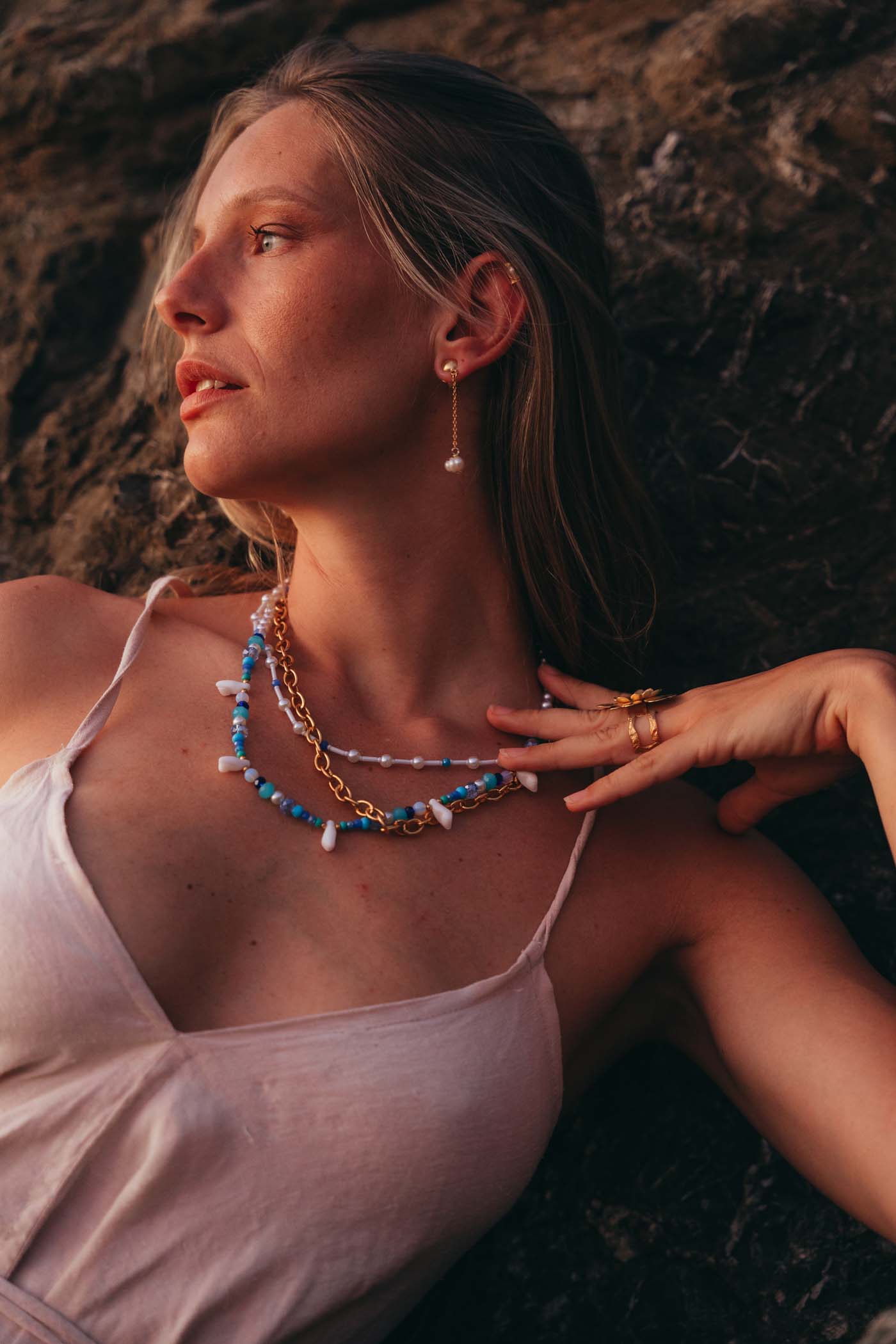 • Set de tres collares con detalles de beads y cristales azules-celestes, llenos de color y personalidad.