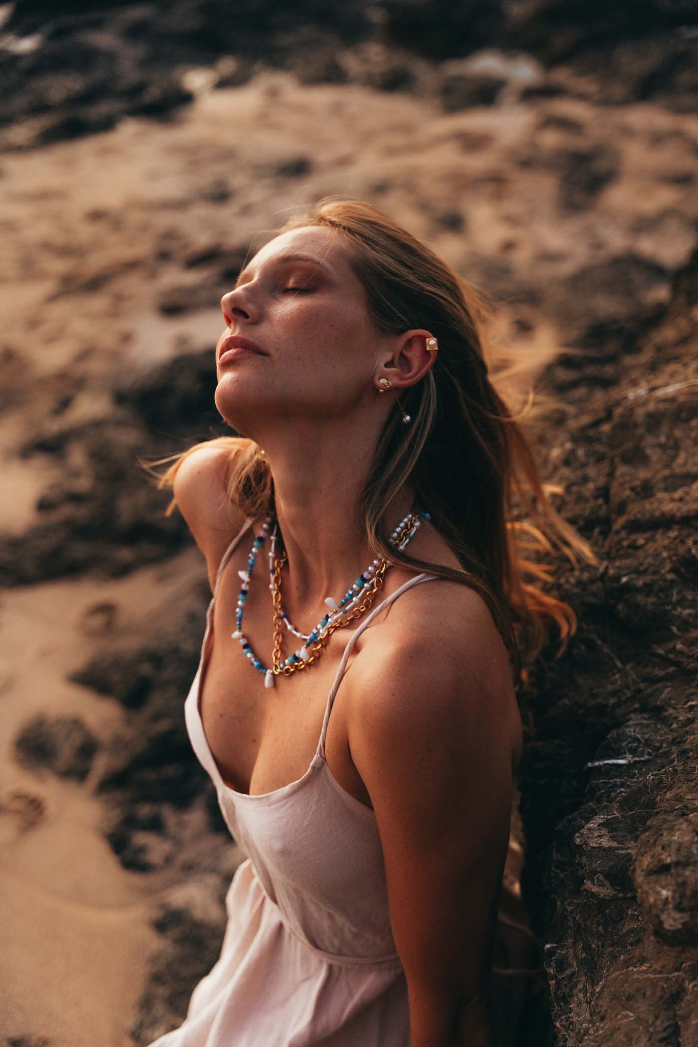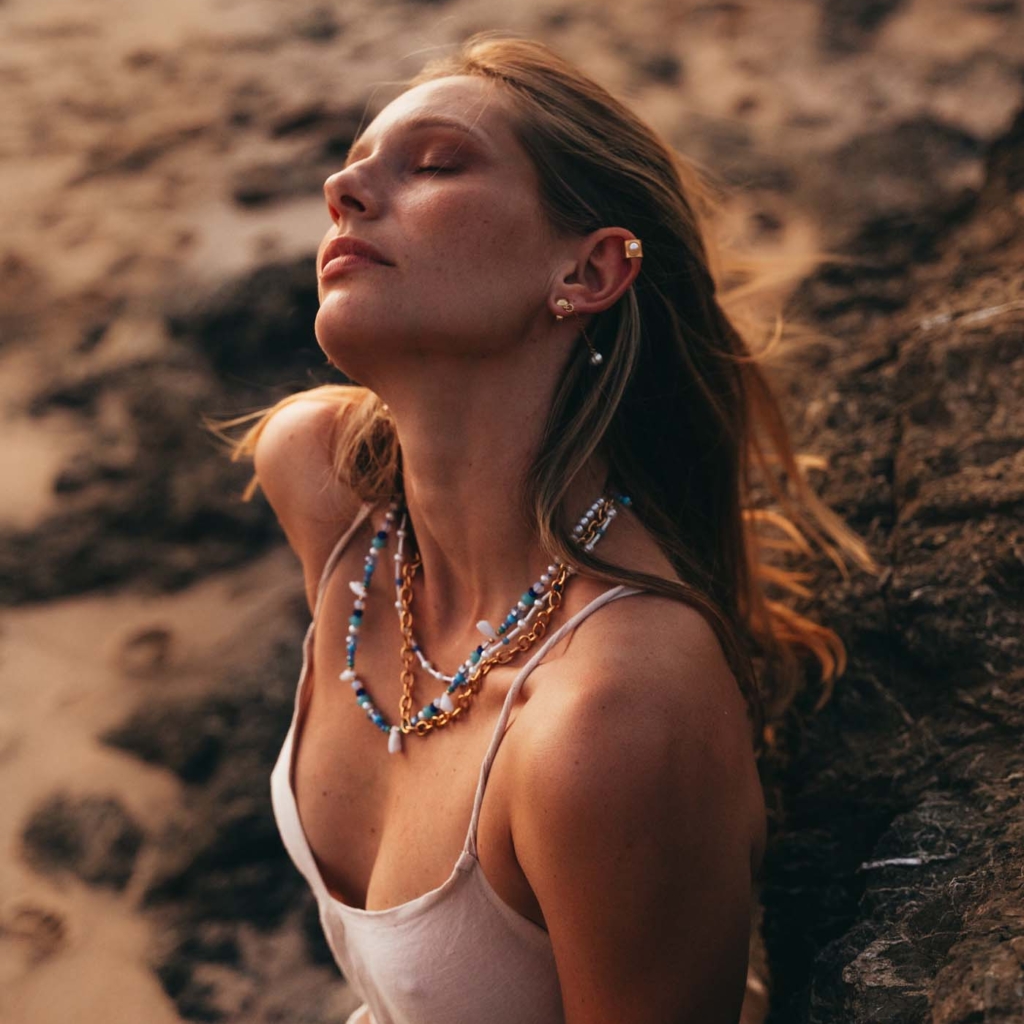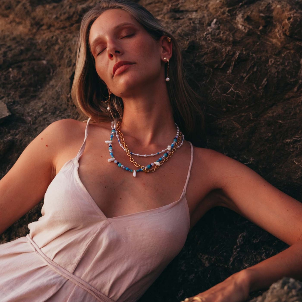 • Set de tres collares con detalles de beads y cristales azules-celestes, llenos de color y personalidad.