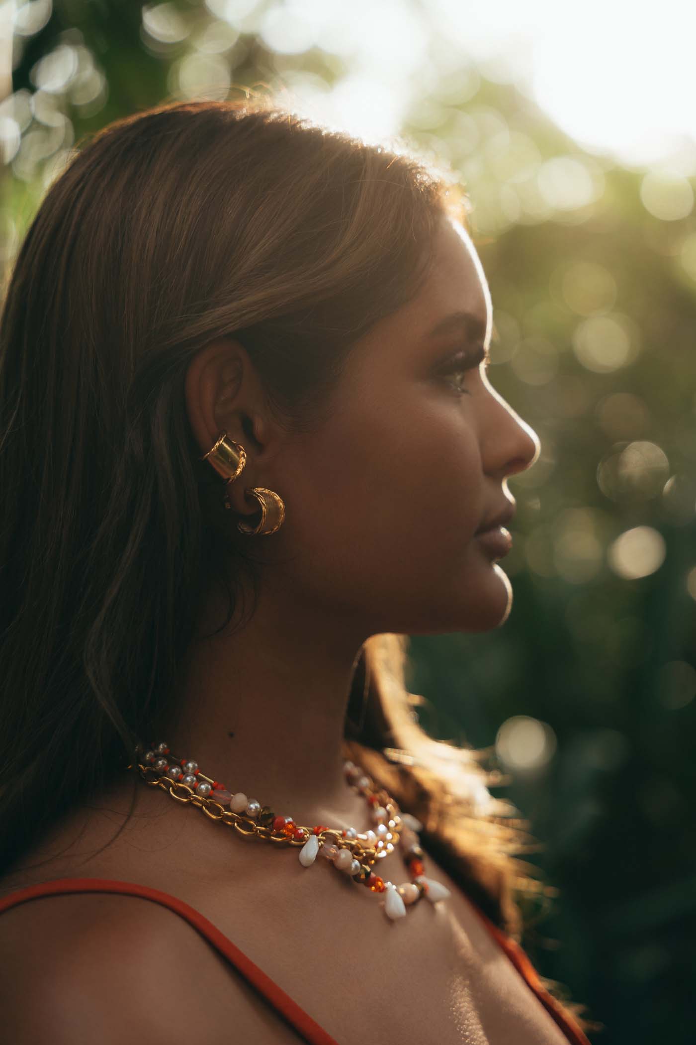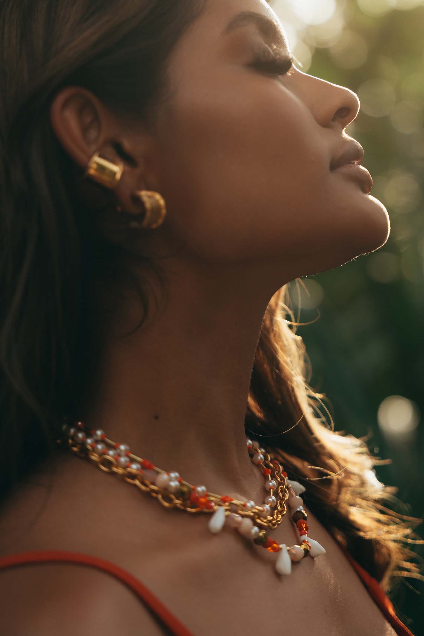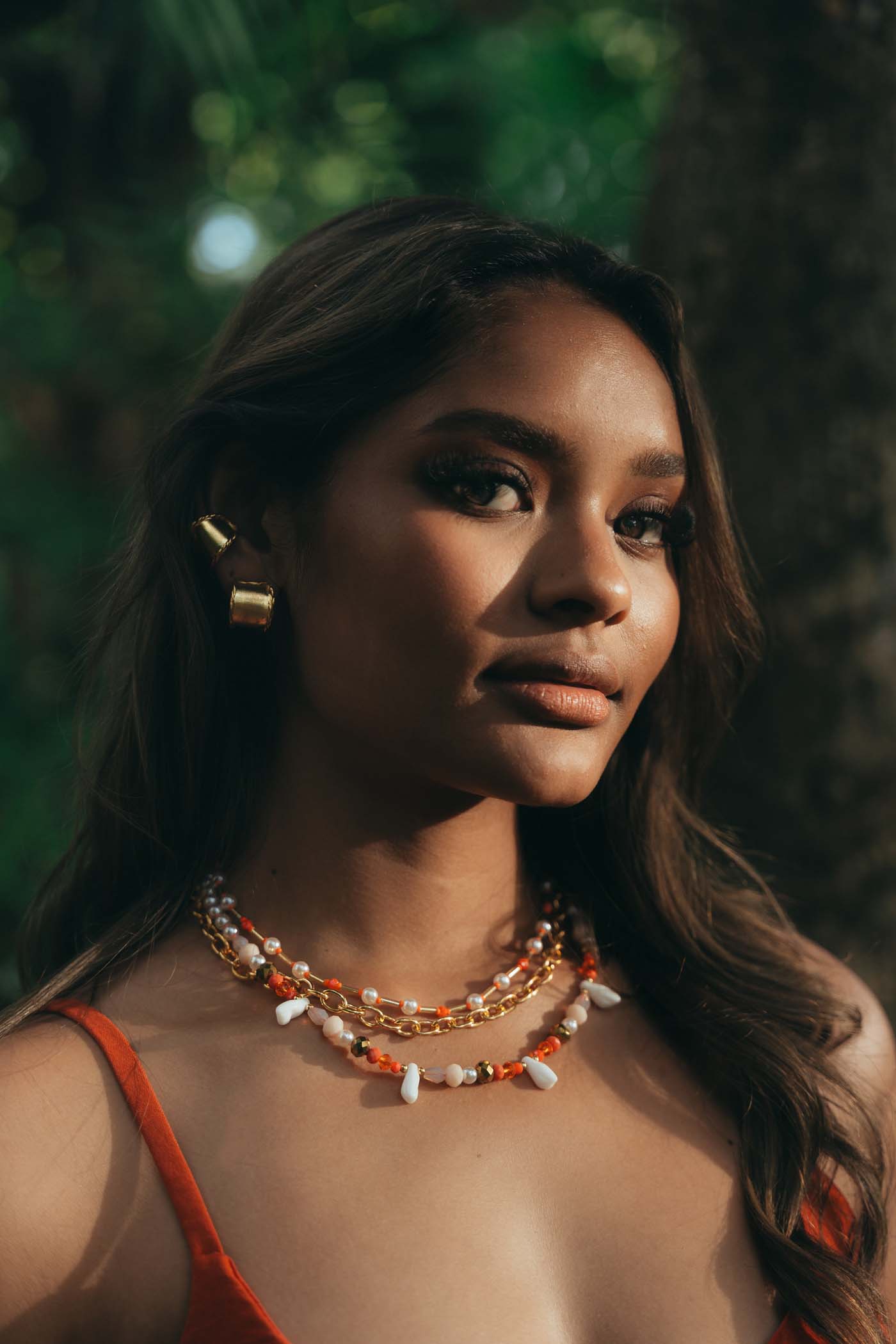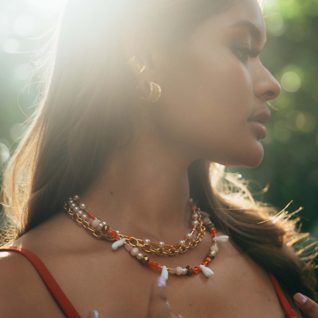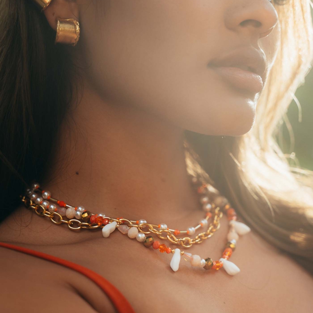 • Set de tres collares con detalles de beads y cristales naranjas, llenos de color y personalidad.