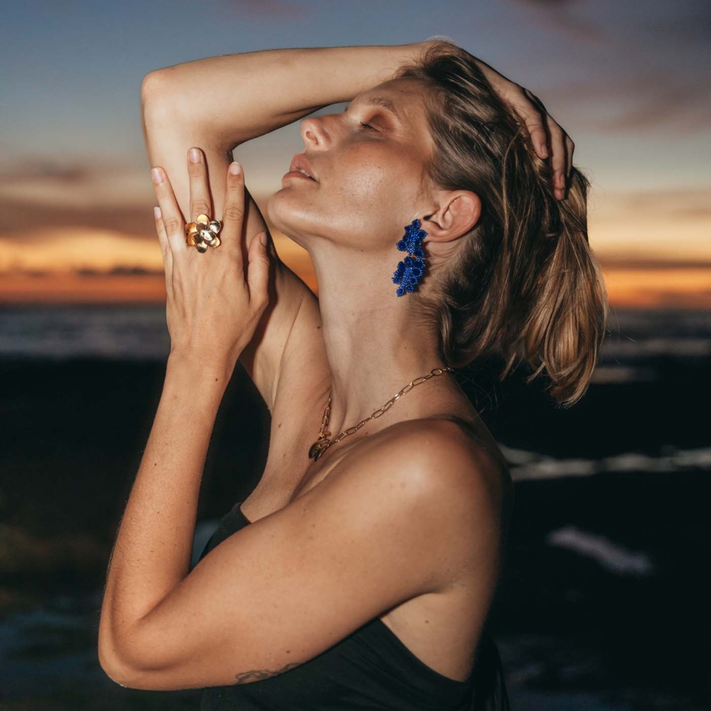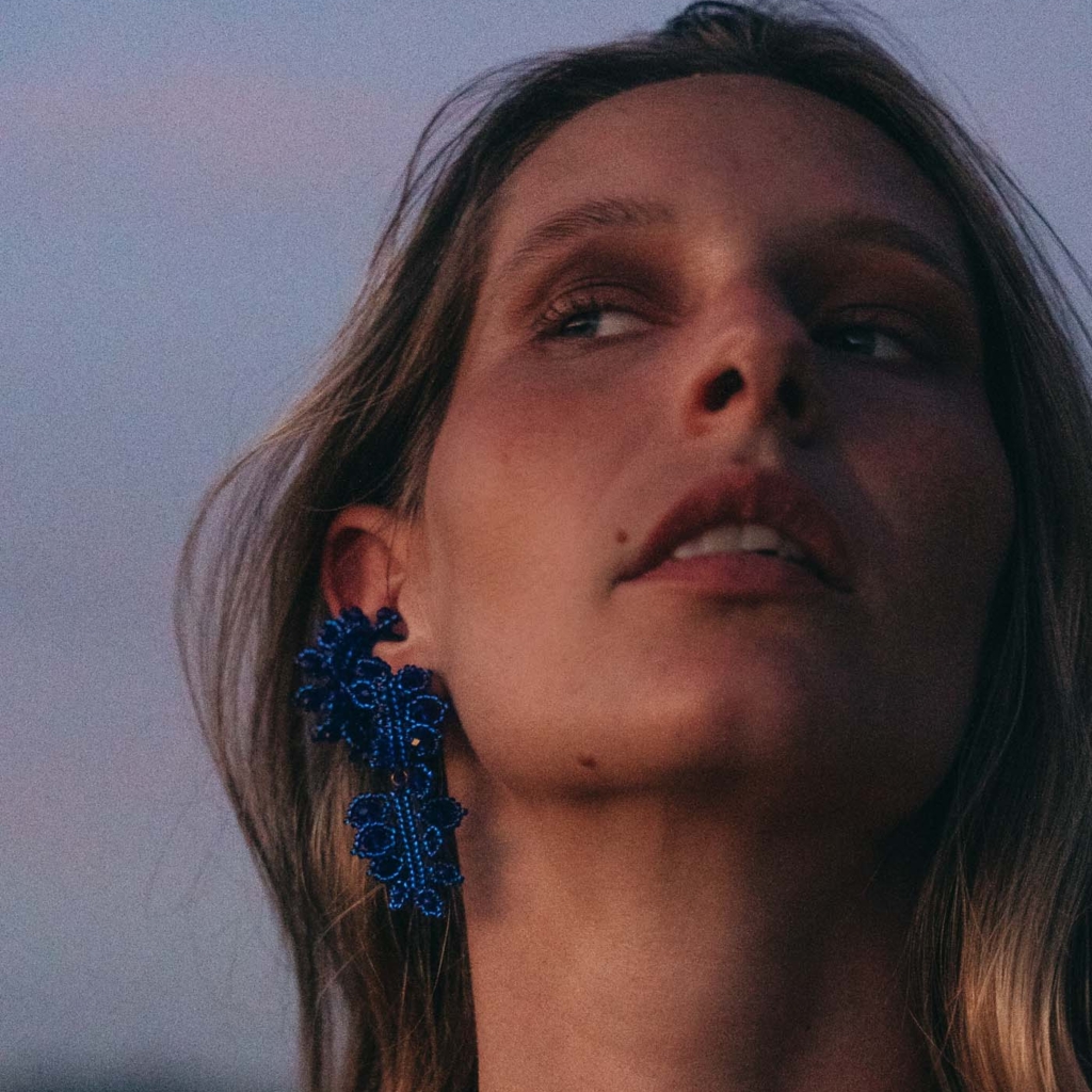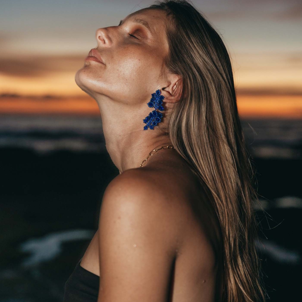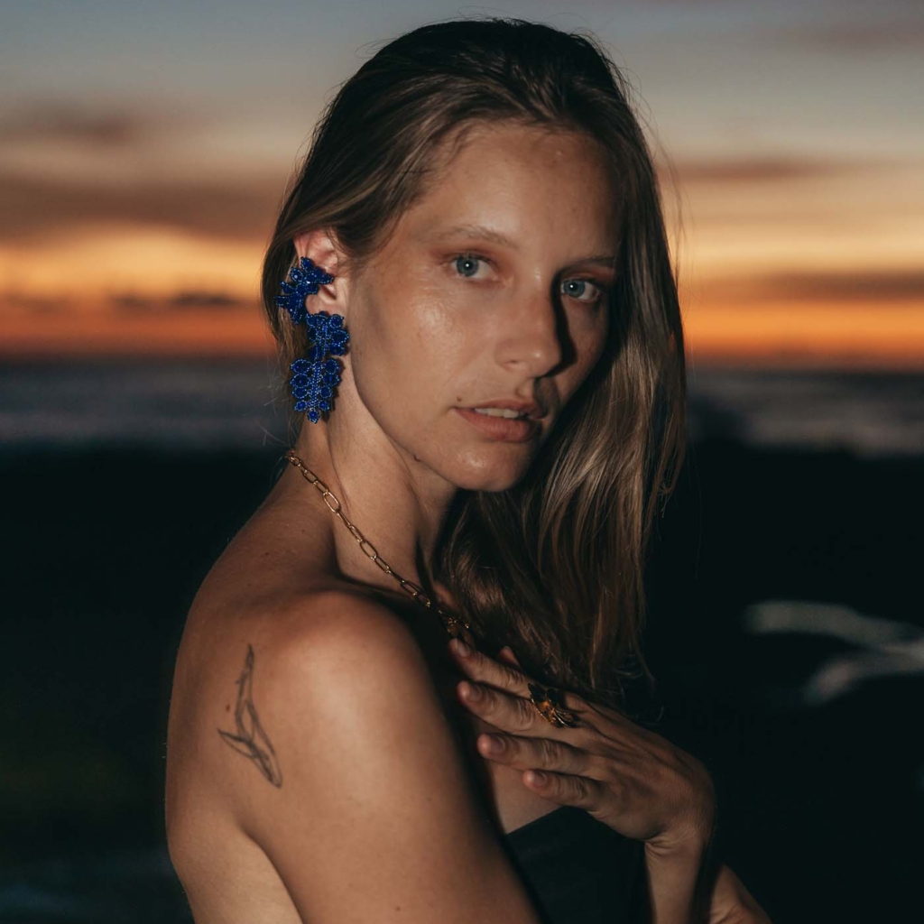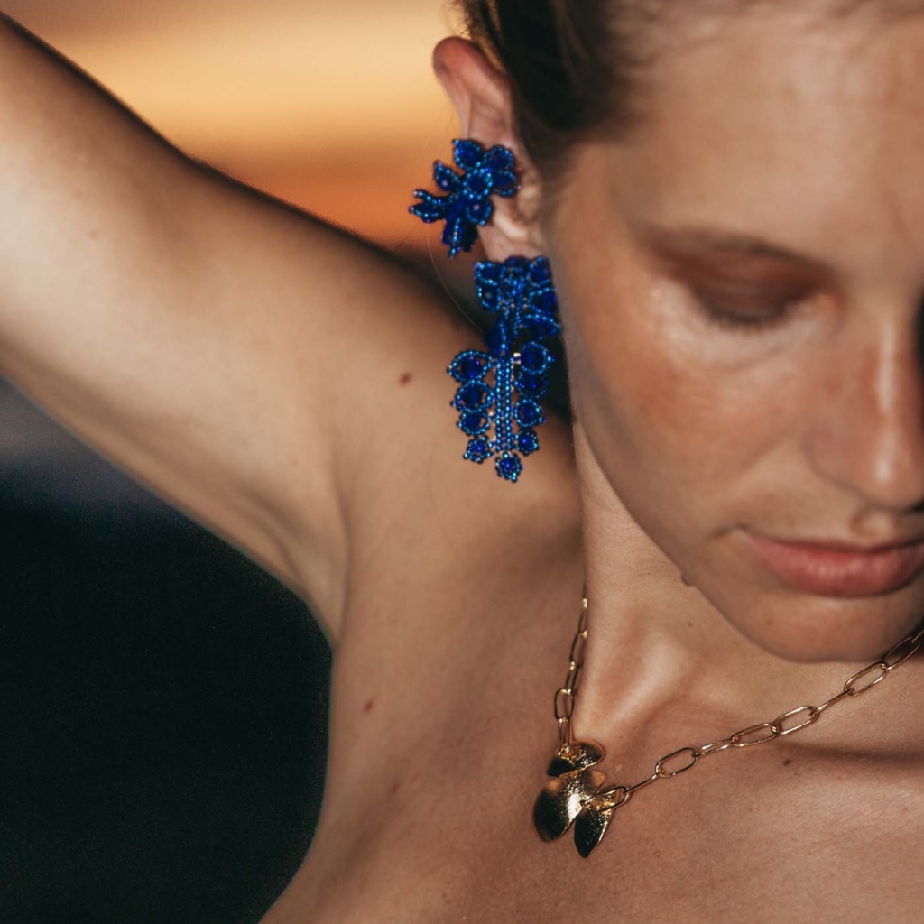 Un racimo de beads y cristales en color azul que cae suavemente, creando un efecto visual lleno de ritmo y fluidez.