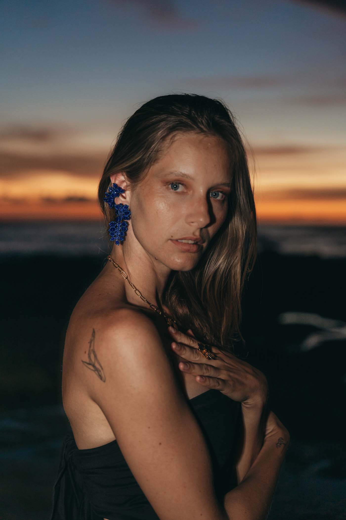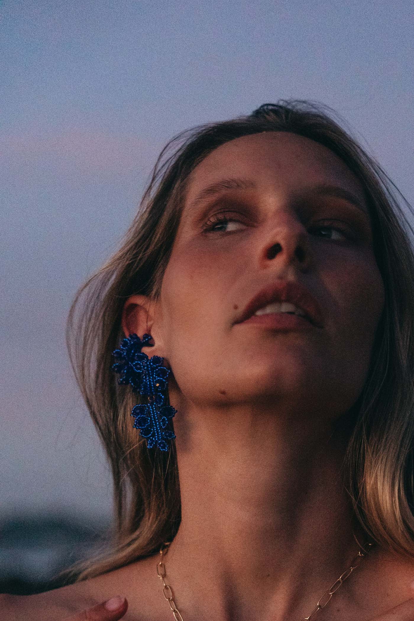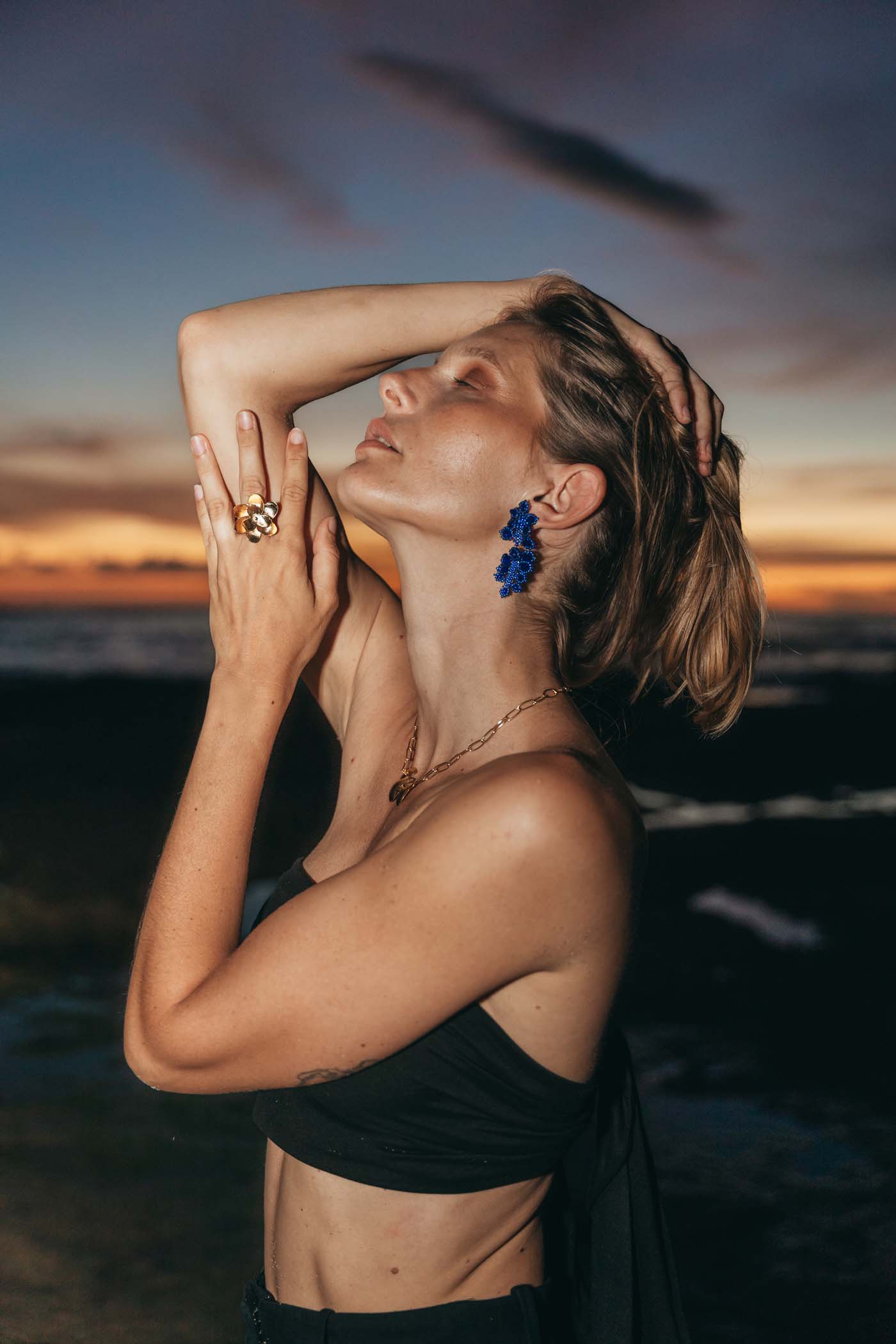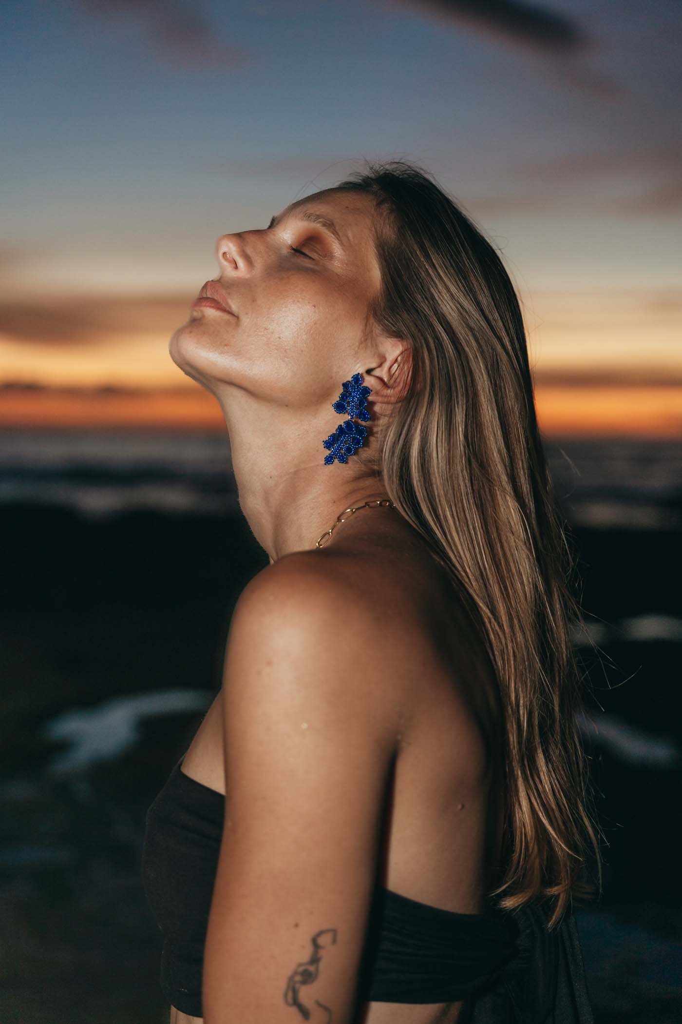 Un racimo de beads y cristales en color azul que cae suavemente, creando un efecto visual lleno de ritmo y fluidez.