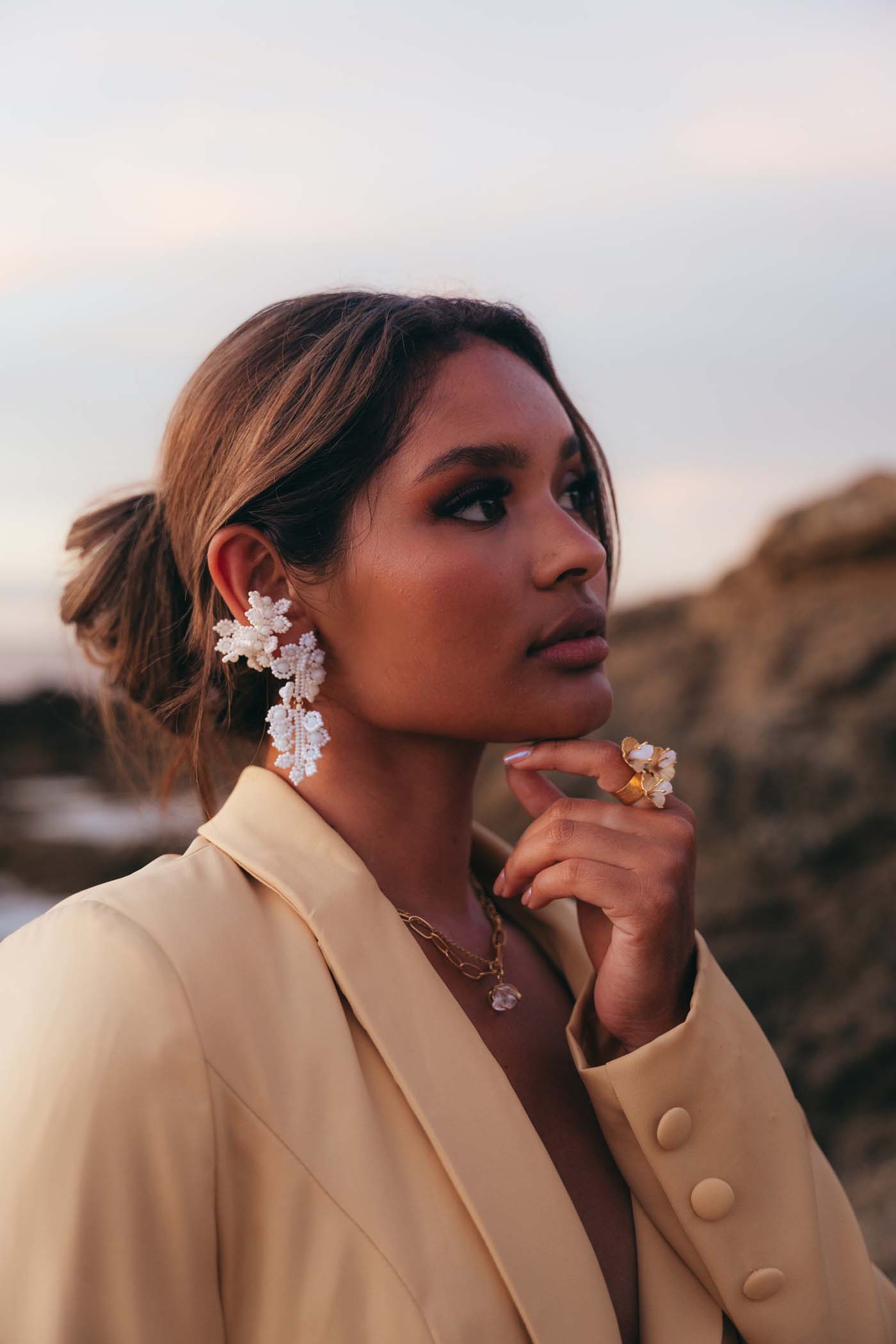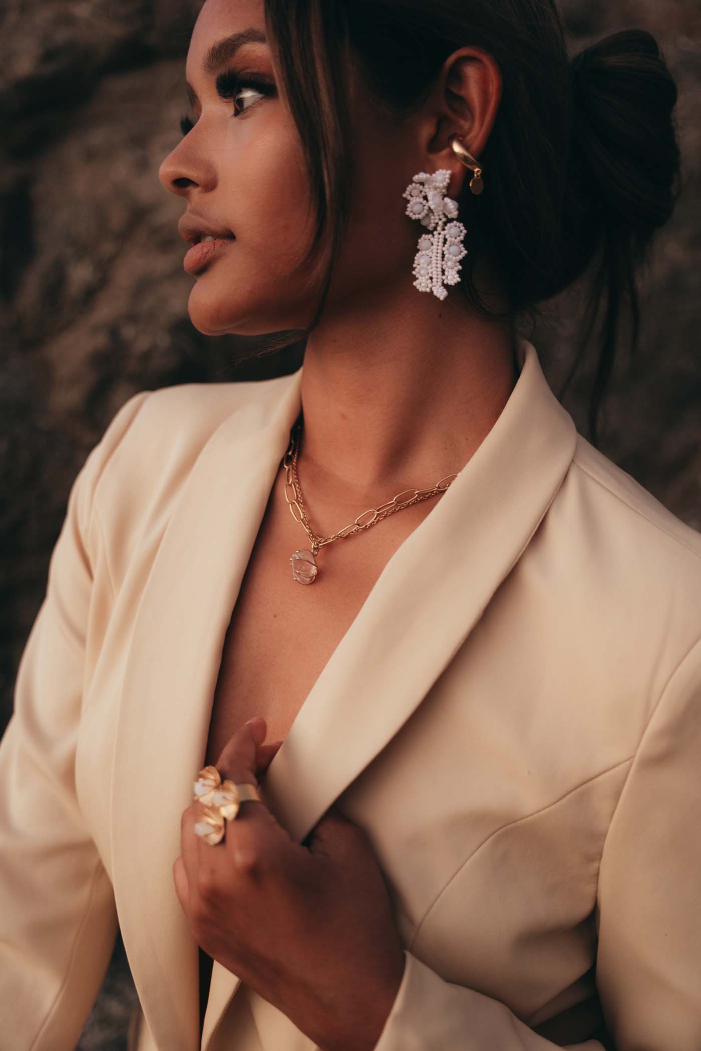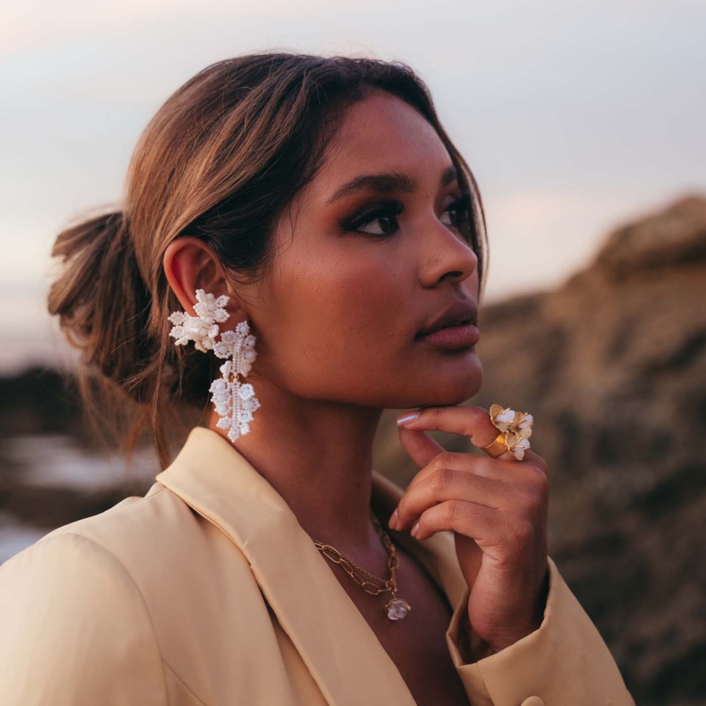 Pequeñas formas que se agrupan con delicadeza, con cristales y beads en blanco creando un diseño etéreo y elegante.
